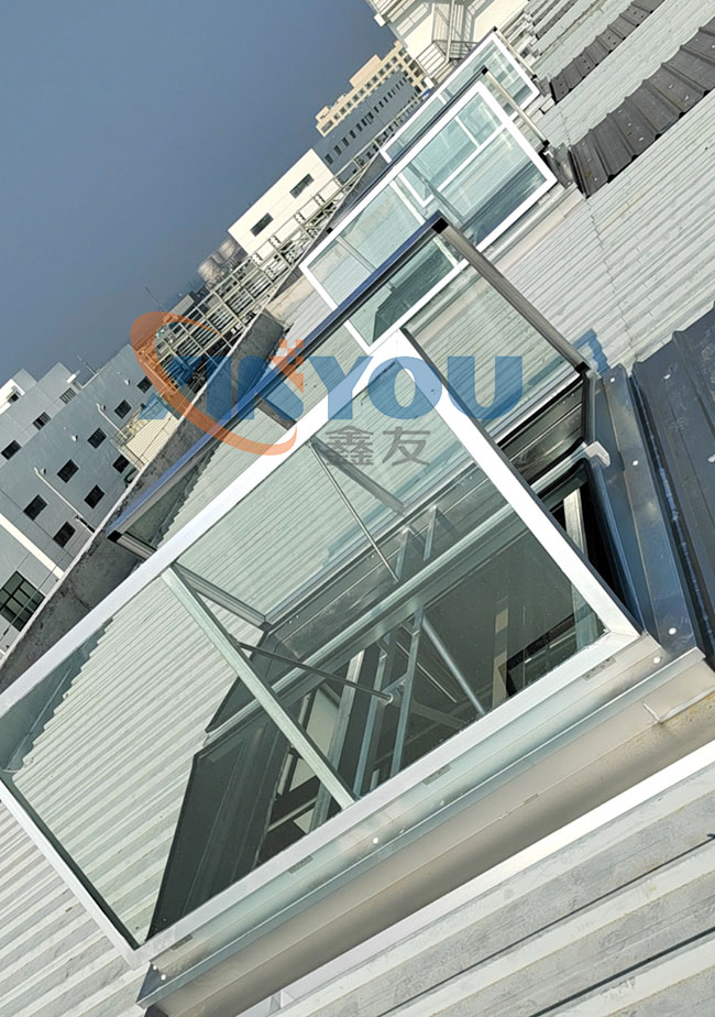 外觀為三角形,頂部為采光板,有效增加室內(nèi)采光,且防水性好。開啟電機(jī)設(shè)計(jì)成24V安全電壓,可連接消防聯(lián)動控制系統(tǒng)及風(fēng)、雨、煙感應(yīng)器。***開啟角度為60°。
